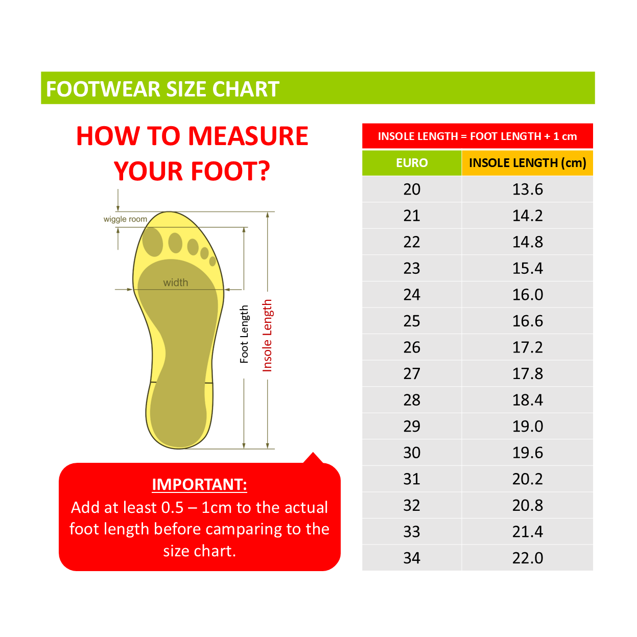 - Size Chart: Compare the total length to our size chart to find the perfect shoe size.
