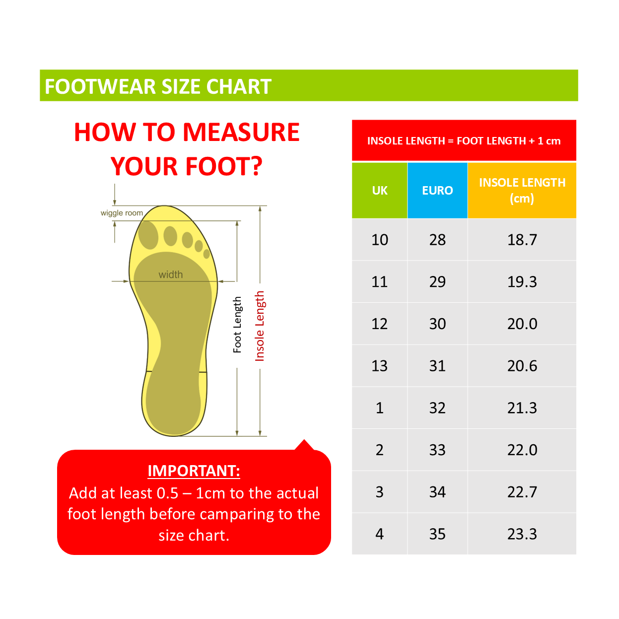 - Size Chart: Compare the total length to our size chart to find the perfect shoe size.