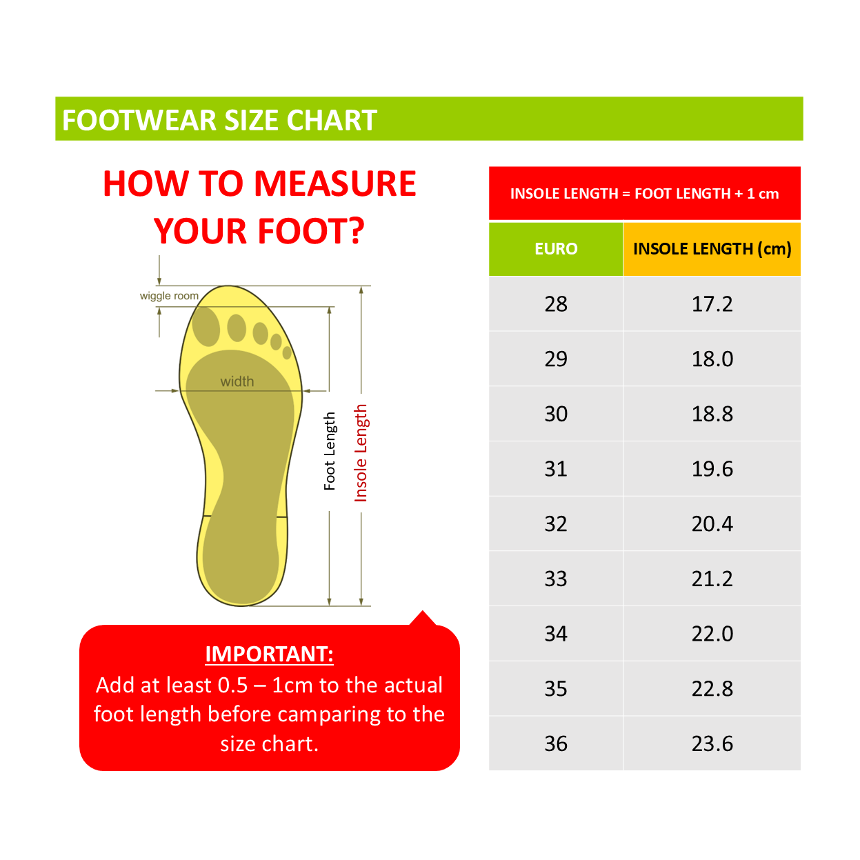 - Size Chart: Compare the total length to our size chart to find the perfect shoe size.