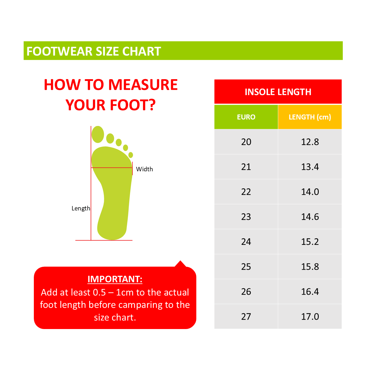 - Size Chart: Compare the total length to our size chart to find the perfect shoe size.